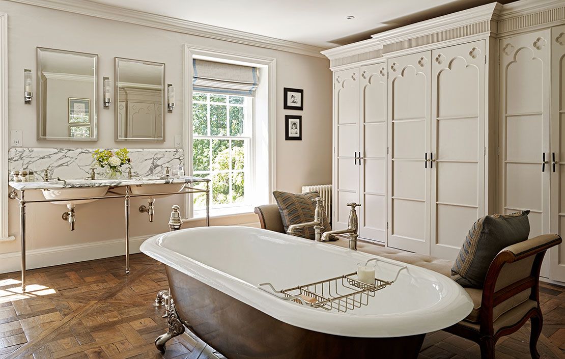The kitchen, for example, now occupies what was once a service basement. Instead of fighting the low ceilings and uneven floors, the designers leaned into the building’s quirks. Bespoke joinery in pale oak was crafted to fit the irregular space, while a cool stone floor nods to the materials of the period. A long, farmhouse-style table brings warmth and functionality, turning the kitchen into the social heart of the home.